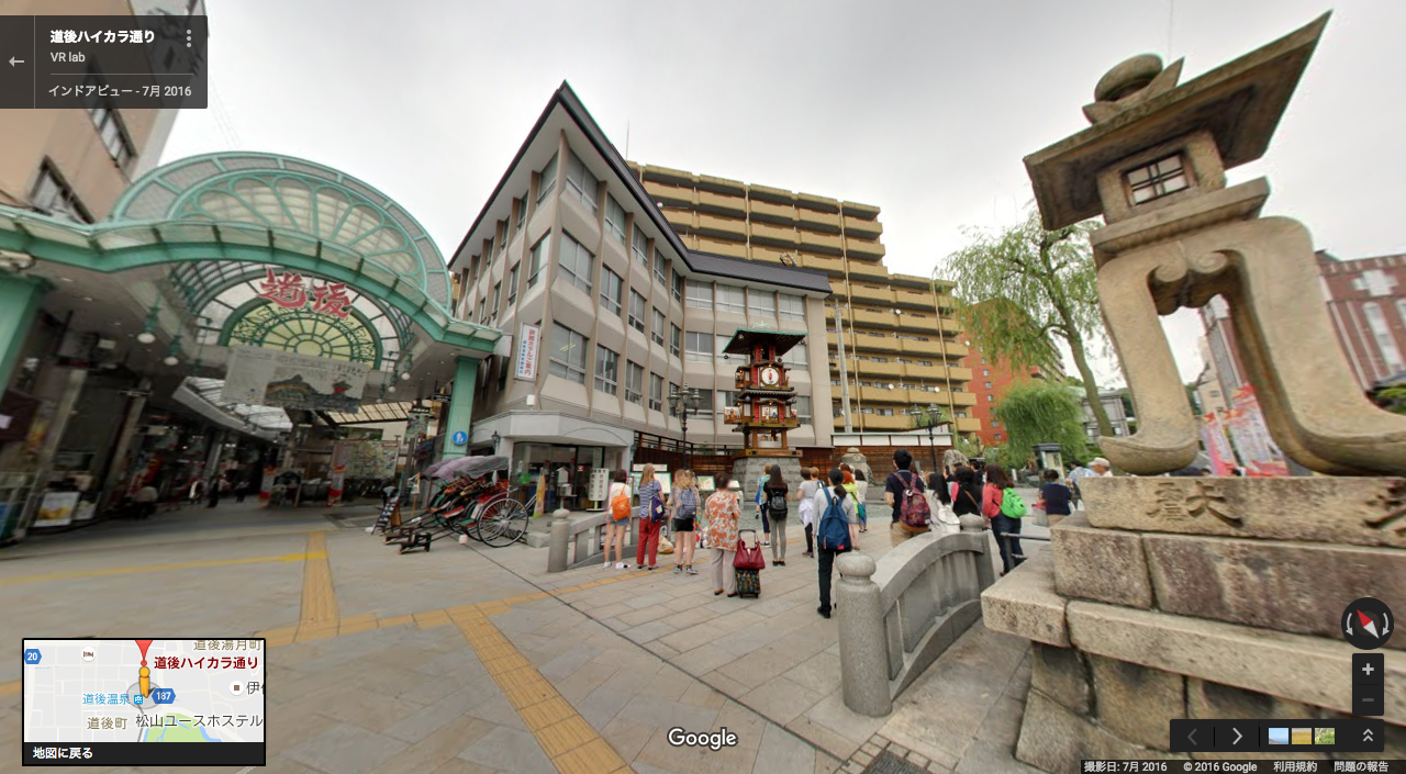 愛媛県松山市の代表的な観光地、道後温泉の目の前から、坊っちゃんからくり時計台へと繋がる商店街、「道後ハイカラ通り」のGoogleストリートビュー撮影を行いました。